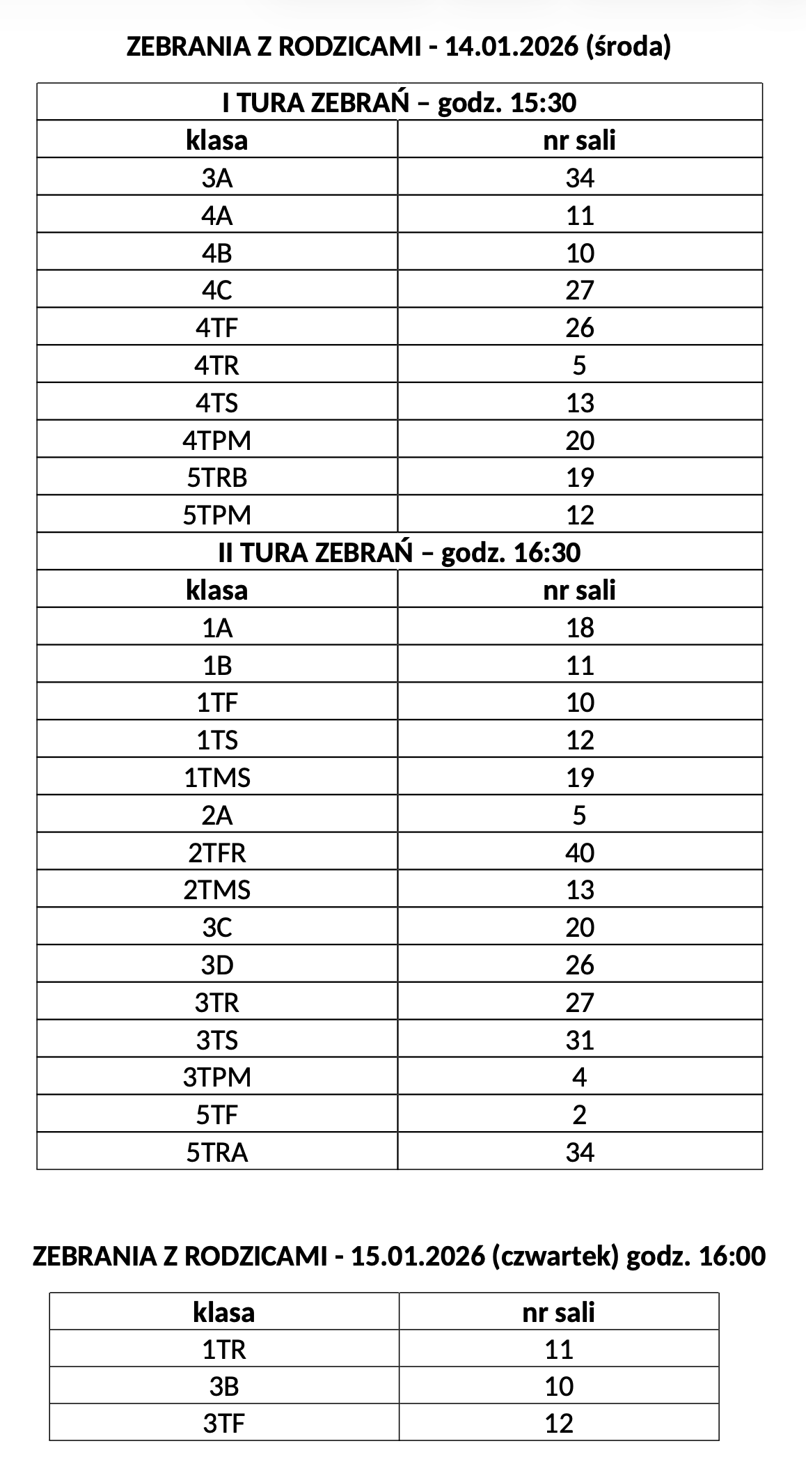 W dniach 14 i 15 stycznia 2026 r. (środa, czwartek) odbędą się zebrania z rodzicami uczniów klas Liceum oraz Technikum Szkoły Szczepanika. Będą to zebrania podsumowujące pierwszy semestr nauki. Zebrania w środę odbędą w dwóch turach: pierwsza o godzinie 15.30, druga o godzinie 16.30. Zebrania w czwartek odbędą się o godz. 16.00. Szczegółowy przydział sal poniżej. Przypominamy o obowiązku uczestniczenia w zebraniach! W środę 14 stycznia rodziców uczniów z klas 1 -3 zapraszamy na spotkanie z psychologiem w ramach programu „Mocni w relacji”, temat prelekcji: „PRZEMOC RÓWIEŚNICZA, JAK WSPIERAĆ DZIECKO”, czas trwania - ok. 45 minut - aula godz. 15.30. Zebranie Rady Rodziców - środa godz. 16:00 (sala 42) - obecność Trójek Klasowych bardzo ważna ze względu na WYBORY nowej Rady Rodziców.
